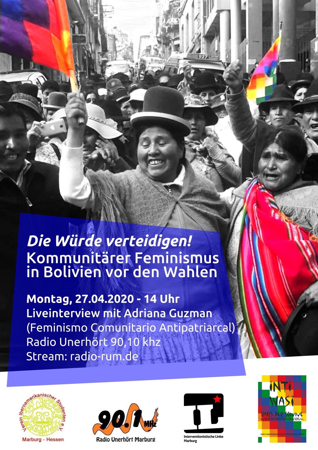 Schaltet am Montag den 27.04.2020 um 14:00 (20:00 in Bolivien) bei Radio-Unerhört ein in Marburg unter der 90,10khz oder im Internet unter https://www.radio-rum.de/blog/stream/ [1].Hinweis: Das Live Interview wird zunächst in Spanisch übertragen, die deutsche Übersetzung wird dann etwas später als Podcast erscheinen.